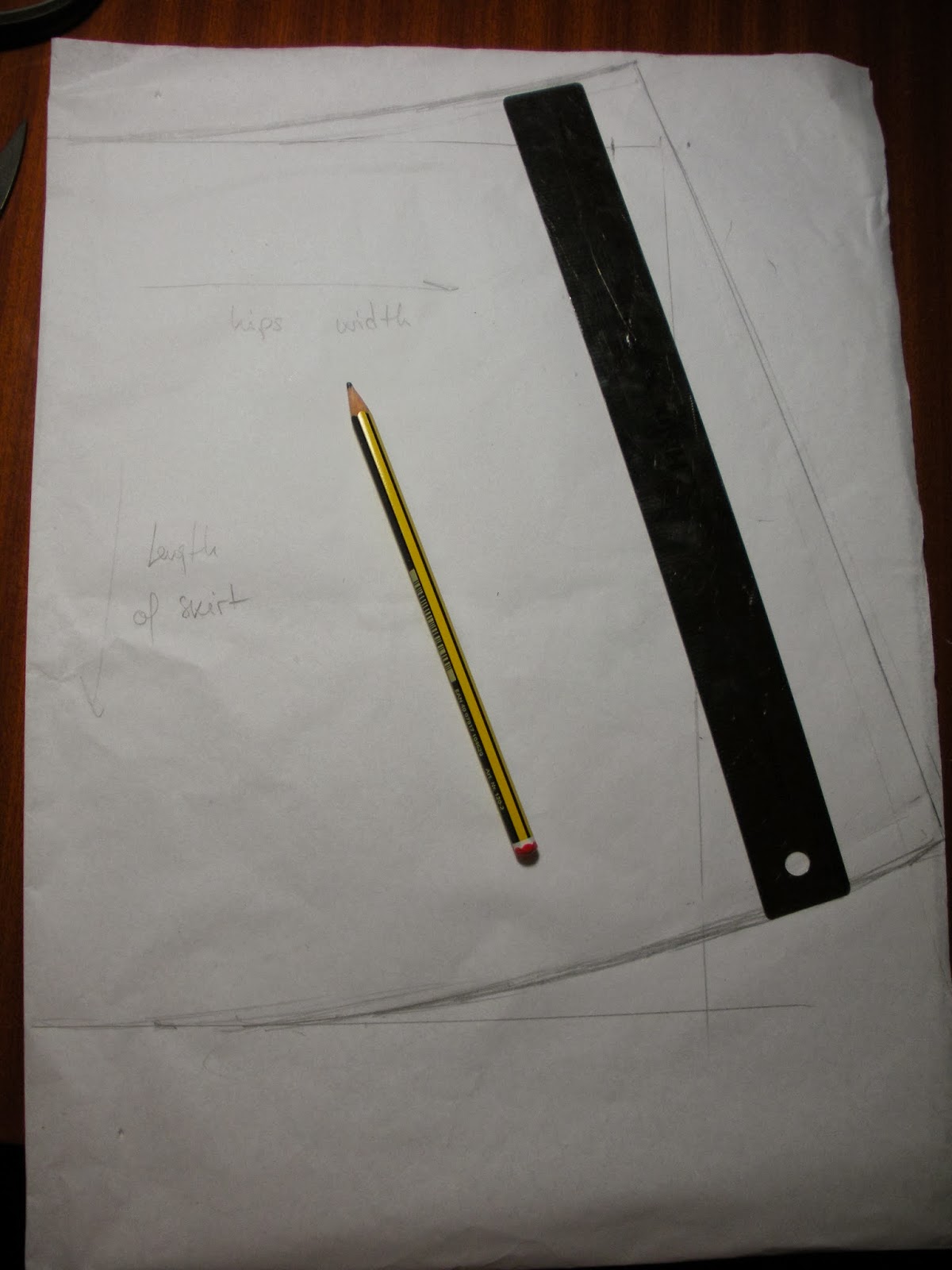 La falda…la verdad me la inventé un poco. Hice un rectángulo/trapezoide o lo que sea teniendo en cuenta mi cintura y mis caderas. Después subí esas lineas haciendo una curva que es lo que la hace tener ese pequeño vuelo. Se ajusta a la cintura pero se abre ligeramente en la cadera